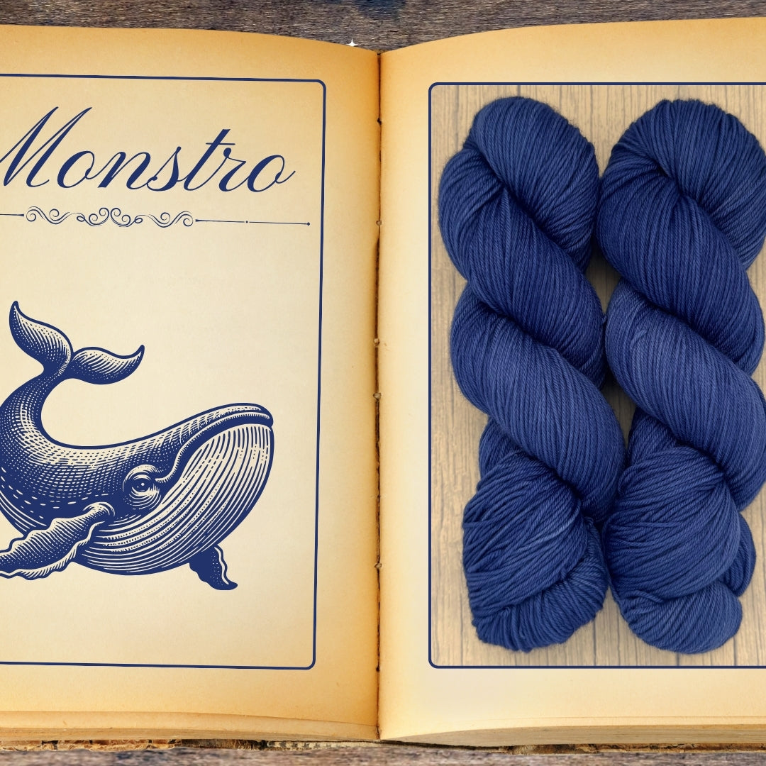 Ahoy there! Gather 'round and listen well, for I have a tale to spin about Monstro, a yarn as deep and grand as the fearsome whale. This here yarn, a rich blue as dark as the belly of the beast itself, will swallow yer project whole, as if the spirit of the beast has been spun into every fiber, offering a softness and strength that befits a sea captain’s finest garb. Whether ye be crafting a fine sweater for a cold, stormy night or a blanket to keep ye warm on long voyages, this yarn'll not let ye down. So hoist yer needles and set sail on a creative voyage with Monstro.