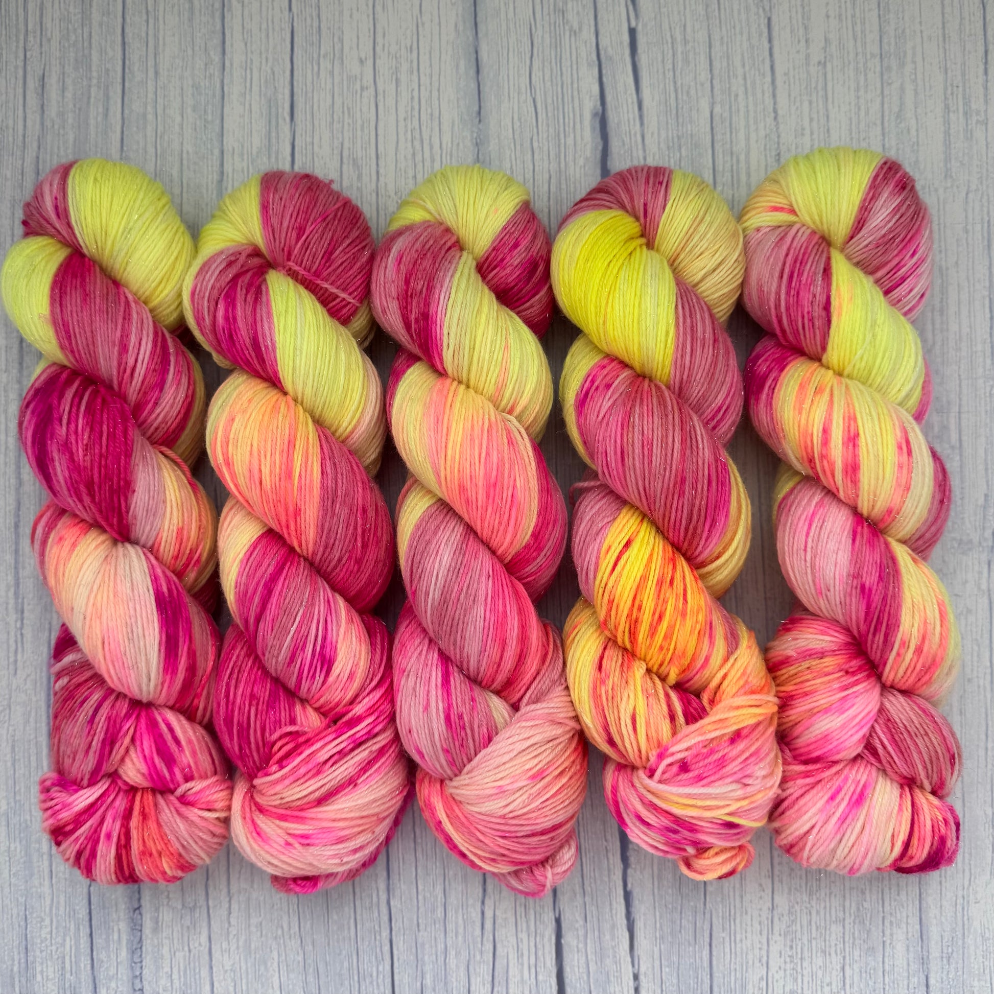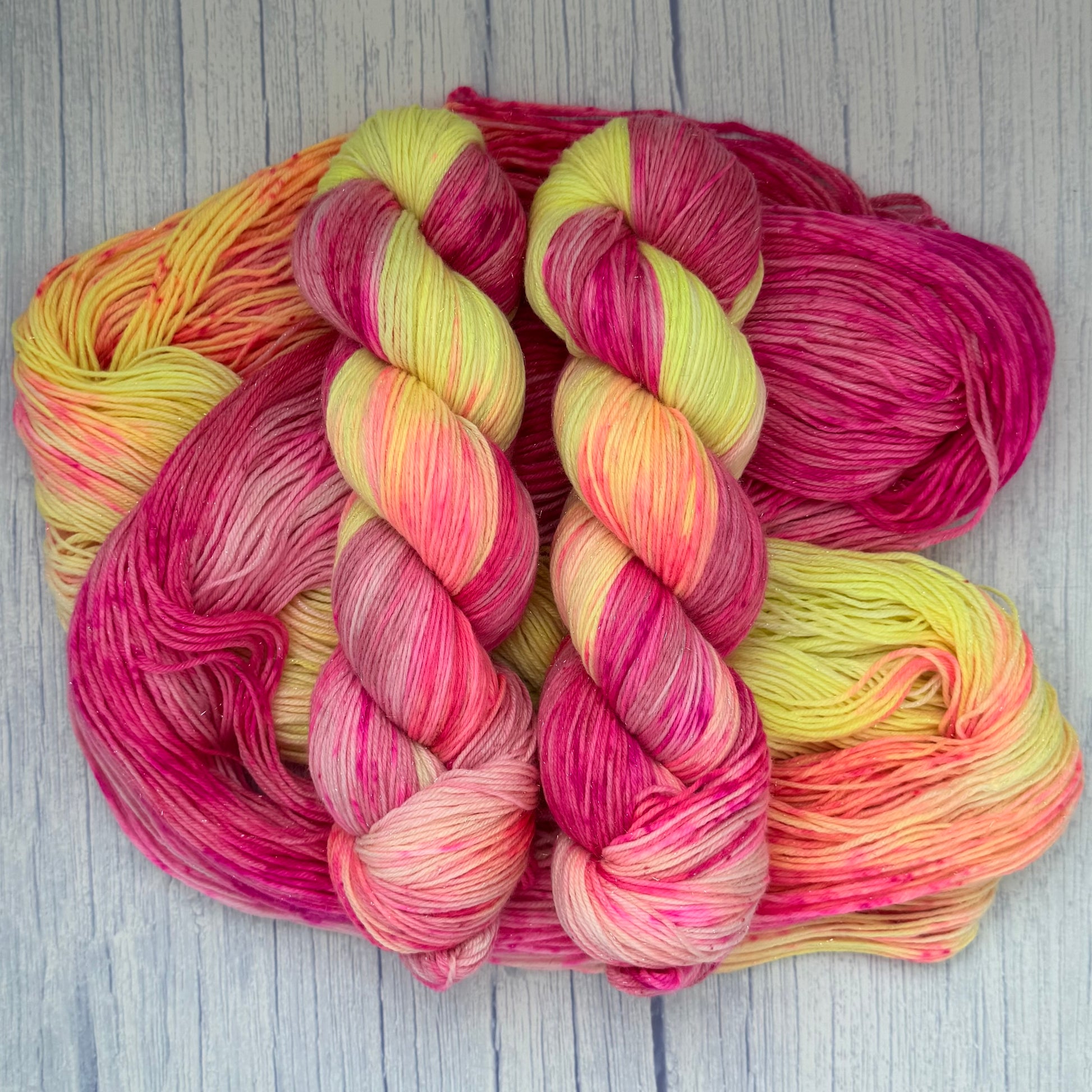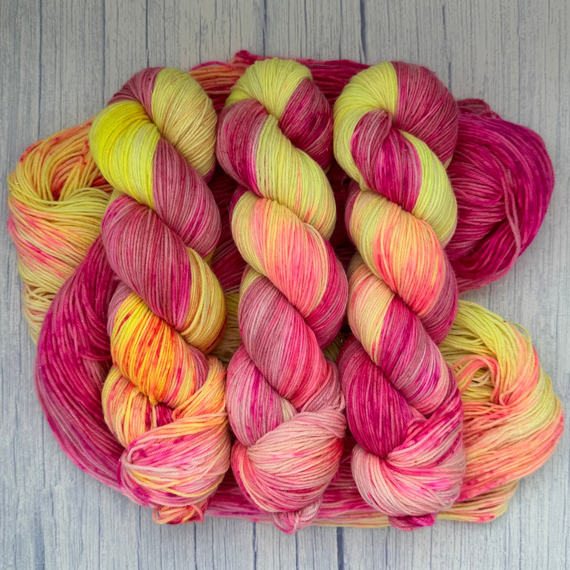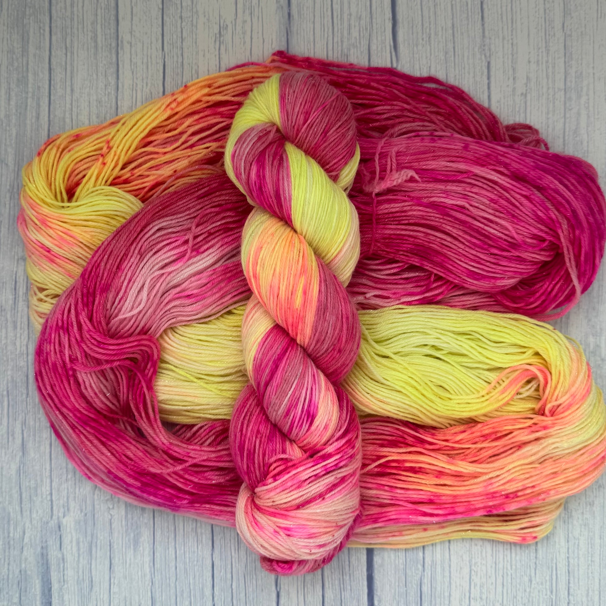 Introducing a taste of our Park Treats Collection, a most delightful swirl of golden pineapple and raspberry pink. Inspired by the irresistible tropical treat this colorway is a deliciously fun way to add a little paradise to your projects. Grab a skein before it melts away.